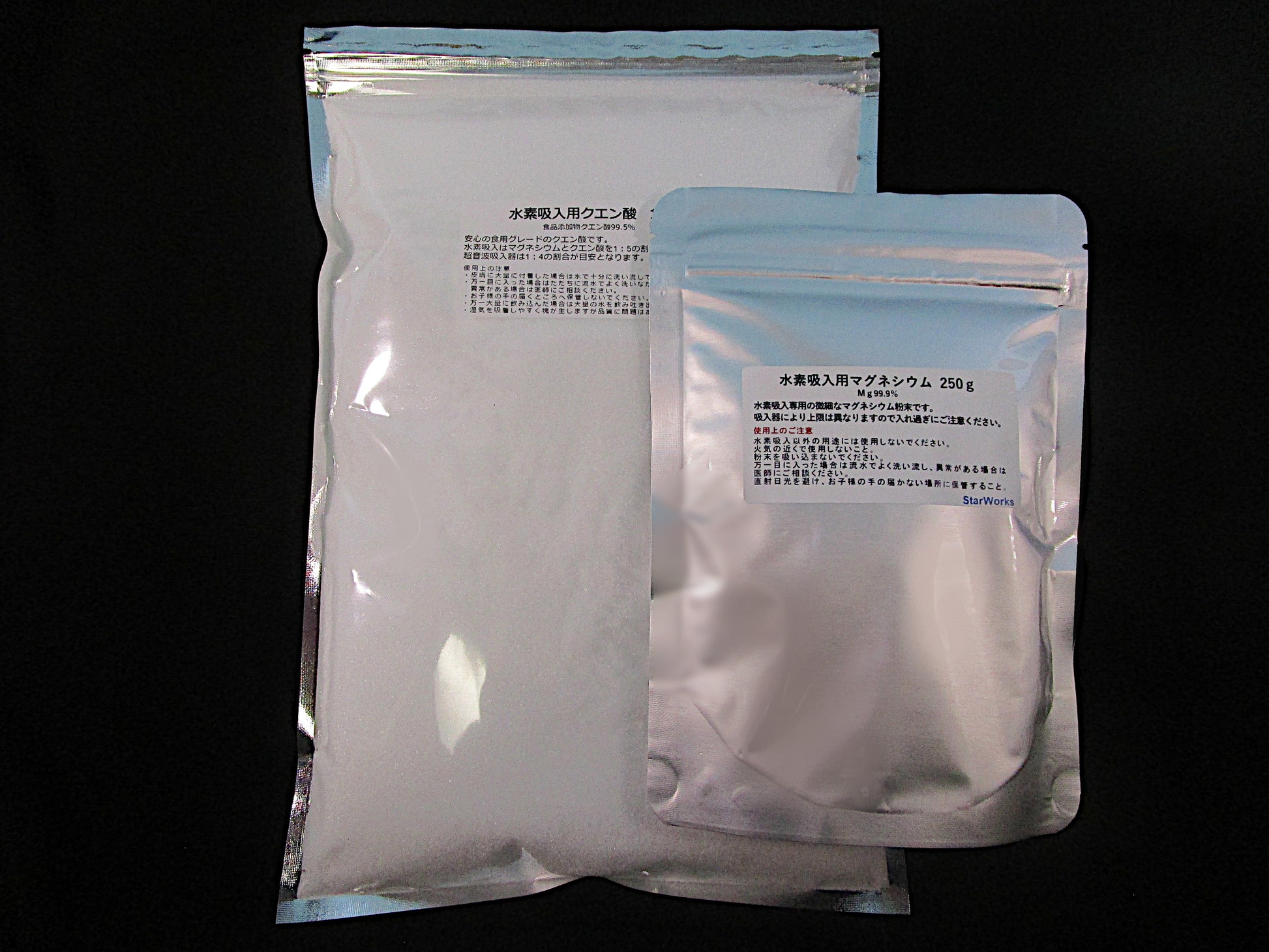一般には販売されていない微細なマグネシウム粉末と水素ガス吸引器用の触媒として使う食品添加物グレード無水クエン酸、純度99.9%です。