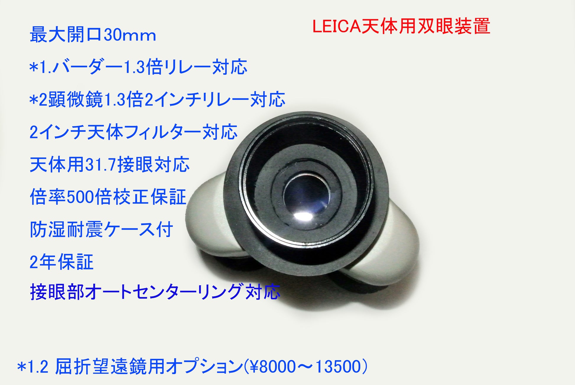 F5程度の短い屈折にも対応できるようにする為、バーダーの1.3倍リレーをアプターリング¥5000で内蔵できるようにもできます。顕微鏡用1.3倍リレー(¥8000)での使用も可能です。性能はどちらでも変わりませんが、どちらも使用できるようにしました。